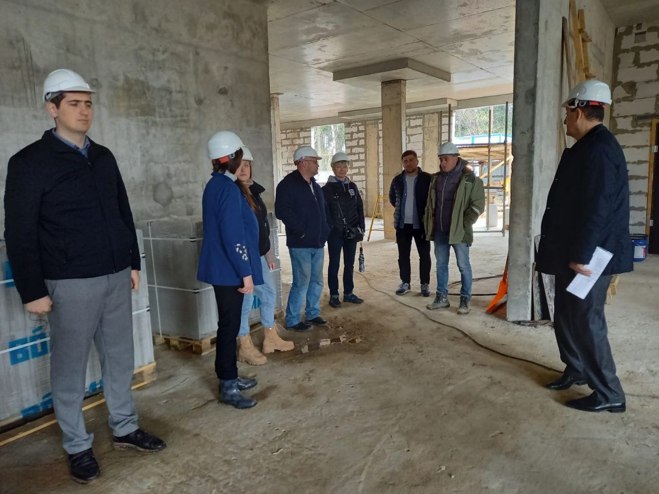 Выездной мониторинг показал: к настоящему моменту строители завершают возведение третьего этажа трехэтажного здания, ведутся работы по гидроизоляции стен подвала, прокладке наружных и внутренних инженерных сетей, ведётся кладка стен и перегородок внутренних помещений, подготовка основания для стяжки пола.