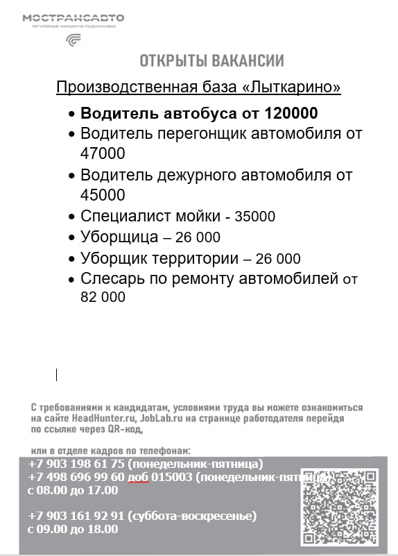 АО «Мострансавто» приглашает водителей автобусов на работу в Московской области. Условия:
