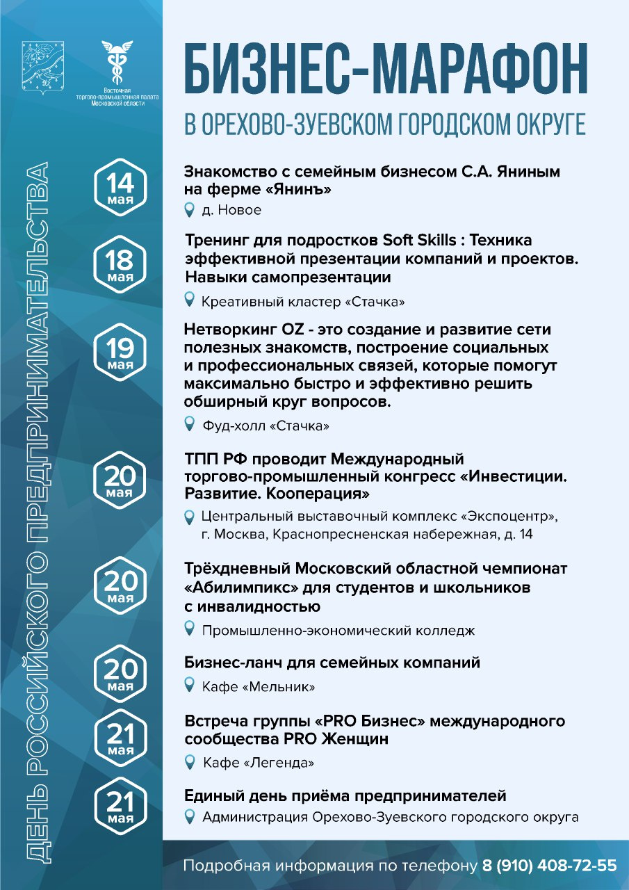 В Орехово-Зуевском округе традиционно запланирован ряд мероприятий, приуроченных ко Дню российского предпринимательства. Приглашаем представителей бизнеса и граждан, желающих открыть своё дело, принять участие в бизнес-марафоне. Подробности по телефону: 413-10-60 доб.2009.