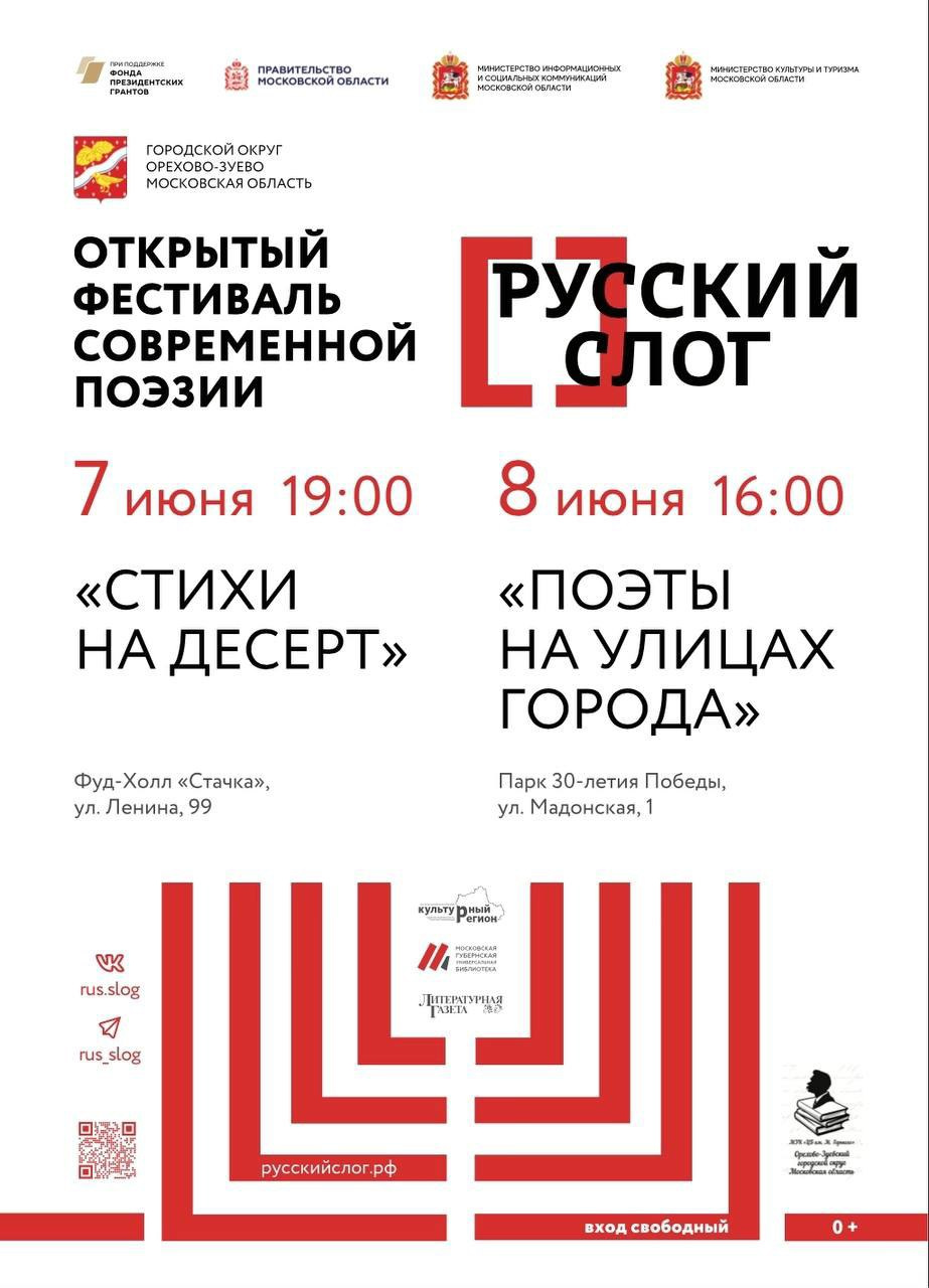 Фестиваль современной поэзии «Русский слог» пройдёт в Орехово-Зуевском округе С 6 по 8 июня в десяти городских округах Подмосковья пройдет фестиваль современной поэзии «Русский слог».