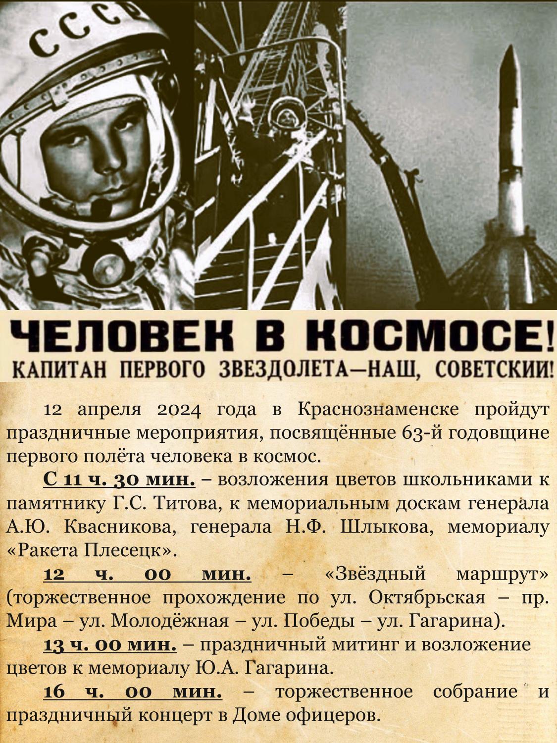 Приглашаем вас принять участие в праздничных мероприятиях, посвящённых 63-й годовщине первого полёта человека в космос – Юрия Алексеевича Гагарина.