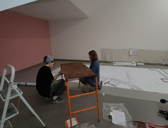 Сейчас стены уже загрунтованы, установлены строительные леса, перенесён черновой рисунок, в ближайшее время художники приступят к поэтапному раскрытию проекта.