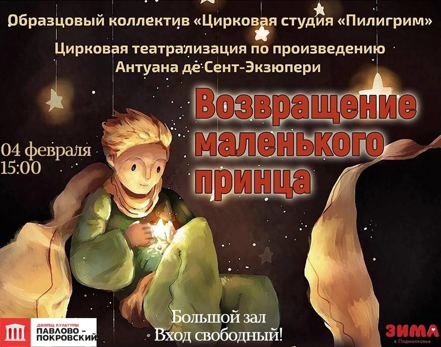 Цирковая театрализация по произведению Антуана де Сент-Экзюпери «Возращение маленького принца» от Образцового коллектива «Цирковая студия «Пилигрим» состоится в Павловском Посаде