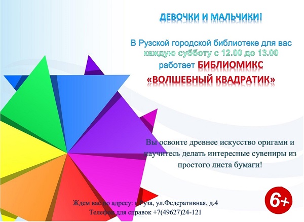 Рузская городская библиотека приглашает юных жителей 20 января в 12 часов на мастер-класс по оригами, который пройдет в рамках библиомикса «Волшебный квадратик».