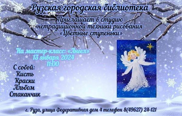 Мастер-класс «Ангел» состоится 13 января в 11 часов в студии нетрадиционной техники рисования «Цветные ступеньки» Рузской городской библиотеки.