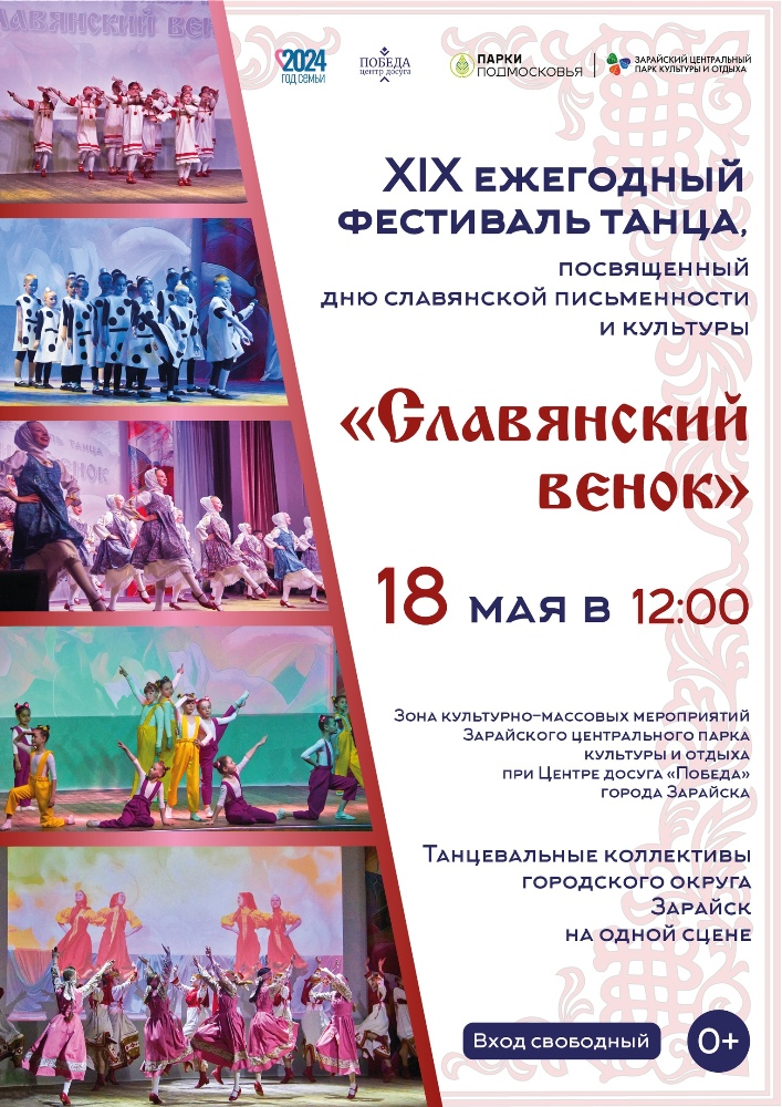 В Зарайске состоится ежегодный праздник танца «Славянский венок», который пройдёт в рамках Года семьи. 18 мая в 12:00 в Центральном парке культуры и отдыха Зарайска, в Центре досуга «Победа», состоится XVIII ежегодный праздник танца «Славянский венок». Он будет посвящён Дню славянской письменности и культуры. Праздник танца — это увлекательное шоу, которое приглашает всех любителей танцевального искусства. На сцене выступят танцевальные коллективы городского округа Зарайск, чтобы продемонстрировать своё мастерство, красоту, грацию и пластику.