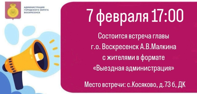 7 февраля в 17.00 глава городского округа Воскресенск Алексей Малкин встретиться с жителями в формате «Выездная администрация». Место встречи: с. Косяково, д. 73б, ДК