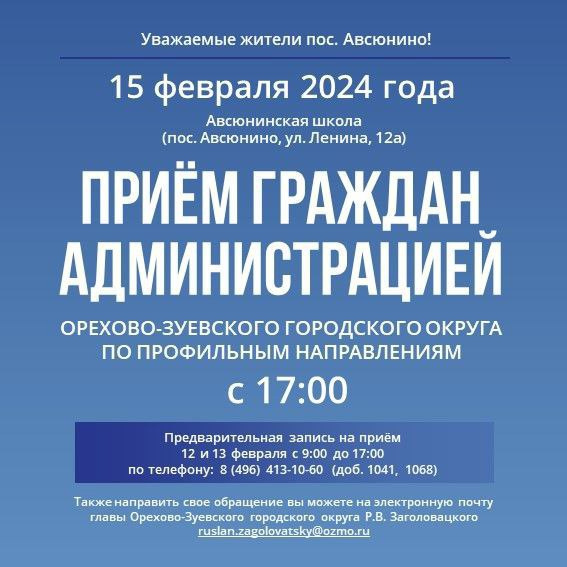 Выездная администрация Орехово-Зуевского округа пройдёт в Авсюнине 15 февраля выездная администрация будет работать в посёлке Авсюнино.