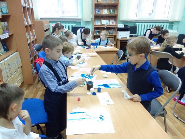 Под руководством библиотекаря ребята с помощью гуаши, ватных палочек и губки рисовали благородного оленя, гуляющего в зимнем лесу.